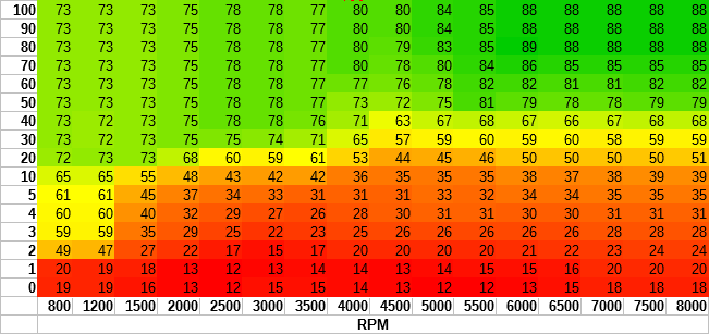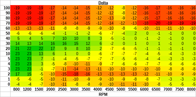 As you can see, the fuel table isn’t perfect, especially at high rpm and part throttle where it was barely touched. Its quite difficult to consistently drive this area of the table! I also did a substantial amount of manual adjustment based on what the wide open throttle numbers suggested. I could smooth it over more but I am going to leave it for now.