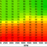 Below is the Volumetric Efficiency (VE) table we started the day with, the table we ended the day with and the difference table showing the changes made. The VE is simply a measure of how much fuel flow the ECU is demanding relative to the amount required to achieve stochiometric mixture at wide open throttle. Technically, if the engine is 100% efficient as an air pump, it would achieve 100% VE across the top of the table.
